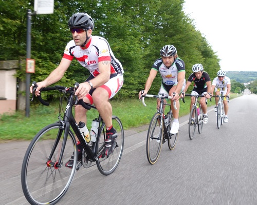 Und nun zum Radfahren. Heute Morgen ging es mal wieder gegen 9.00 Uhr los. Ihr wisst schon, zuerst der Hoxberg. In Körprich angekommen war mal wieder richtig Gedränge am Treff. Gegen 10.00 Uhr ging es los. Wir hatten einen Gast Fahrer aus Kanada. Patrice Gay ist Kanadier und seine deutsche Frau aus Schmelz. Alle Jahre besuchen sie die Eltern. Patrice und ich hatten im July 2011 zusammen mit Martin und Gerard ein Benefiz Rennen in Luxembourg bestritten. Ich habe mich gefreut ihn wieder zu sehen. Heute wurde mal wieder die Runde bis Überherrn absolviert. Das Tempo war mal wieder sehr sportlich. Quasi eine Renn Simulation. 😉 Zwischendurch kam immer wieder eine kleine Abkühlung vom Himmel. Kleine Schauer erfrischten uns in der Schwüle des Morgens. Es hatte mal wieder richtig Freude gemacht mit den Kollegen zu fahren. Es ist eine sehr homogene Gruppe. Das Fahren im Wechsel gegen den Wind klappt hervorragend. Am Ende war es ein 32,6 er Schnitt und knapp 100 Km. Das Weizenbier am Ende schmeckte wieder klasse.
